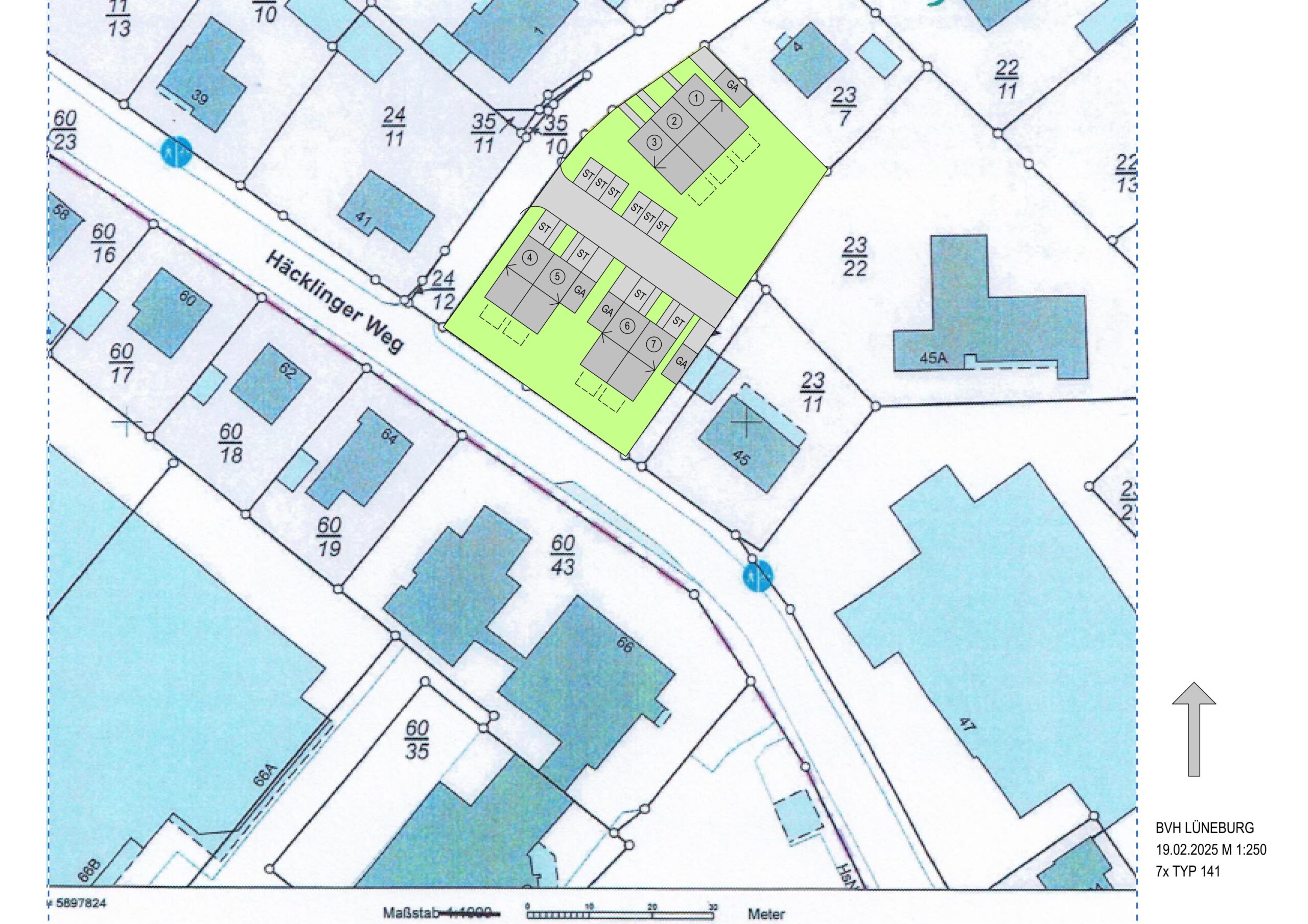 7 residential units in Lüneburg: 2 semi-detached houses and 3 townhouses with 14 parking spaces. Development in compliance with zoning plan.