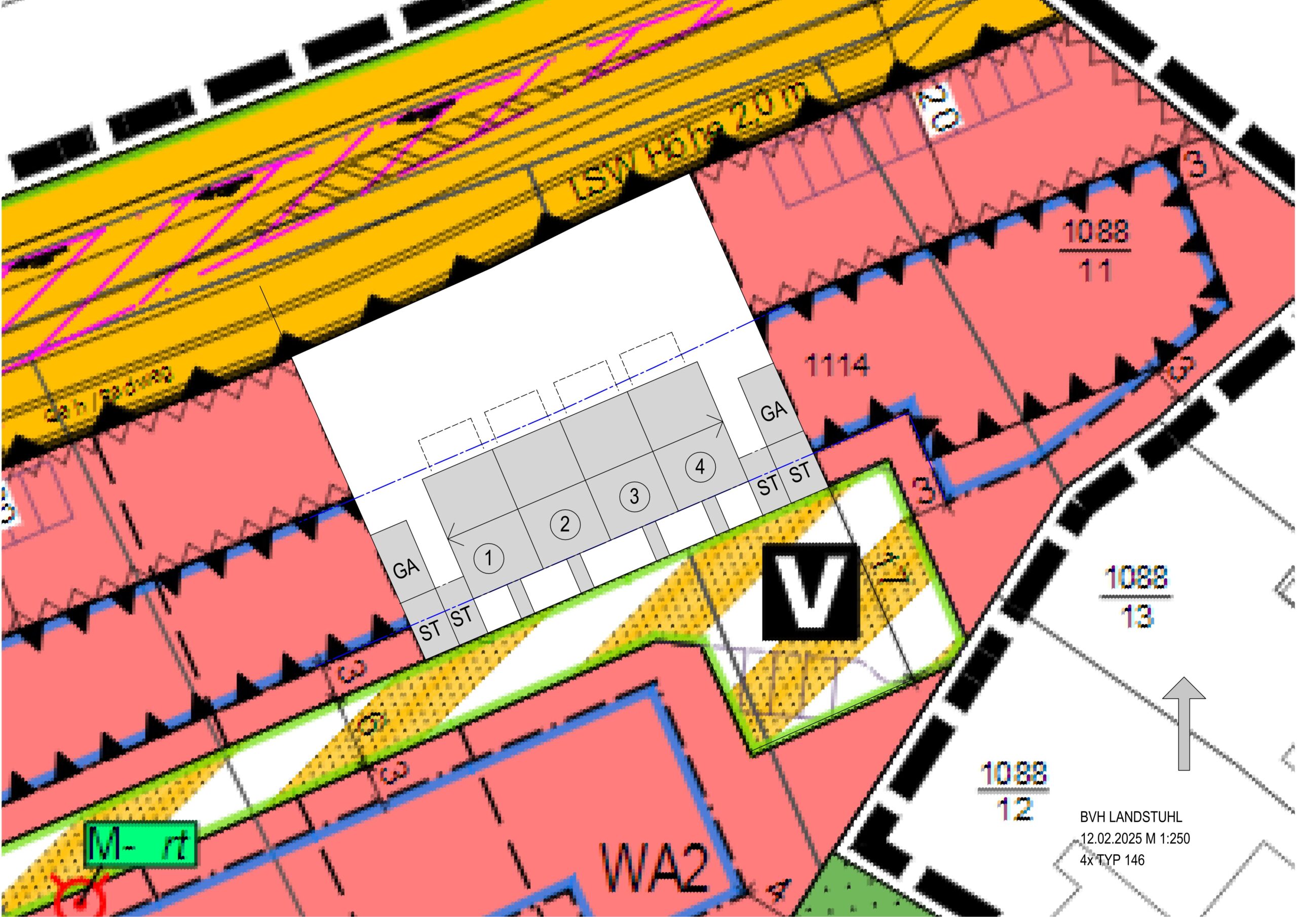 4 townhouses in Landstuhl with 4 parking spaces and 2 garages. KfW 40 QNG+, fully sold.
